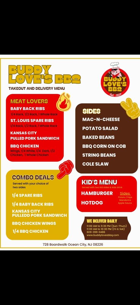 Welcome to Buddy Love's BBQ, a gem nestled on the bustling boardwalk of Ocean City, NJ. Their menu is a heartfelt celebration of soul food BBQ, expertly crafted to tantalize your taste buds. Indulge in their brisket and ribs, praised for their tender, flavor-packed meat that falls effortlessly from the bone. Each dish comes with a variety of delightful sides like rich mac and cheese and smoky baked beans, all priced at just $4.75. For families, an enticing kids menu features affordable options such as a cheeseburger or hotdog.
